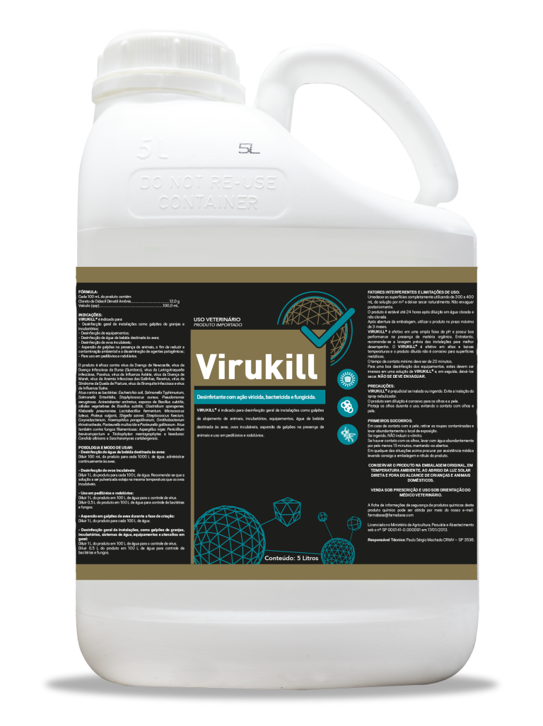Virukill® is a disinfectant of the latest generation that has in its formulation twin chains of modified structure based on DDAC (Didecyl-dimethylammonium chloride) associated with a potent surfactant that potentiates and widens its spectrum of action.