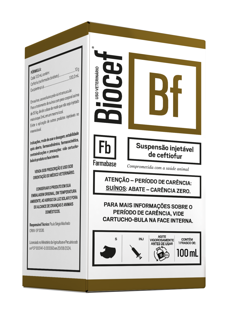 BIOCEF® é um antibiótico injetável à base de ceftiofur a 10%, uma cefalosporina de terceira geração, de uso exclusivo na medicina veterinária, tendo como característica seu potente efeito bactericida. A formulação exclusiva de BIOCEF® permite uma ampla distribuição tecidual, possibilitando o tratamento de diversas enfermidades com uma única dose e com período de carência zero.