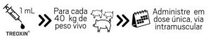 TREOXIN® é indicado para o tratamento de doenças respiratórias em suínos ocasionadas por Actinobacillus pleuropneumoniae, Bordetella bronchiseptica, Glaesserella parasuis, Mycoplasma hyopneumoniae e Pasteurella multocida na dose de 2,5 mg de tulatromicina, equivalente a 0,025 mL do produto por quilo de peso vivo, em única administração pela via intramuscular.